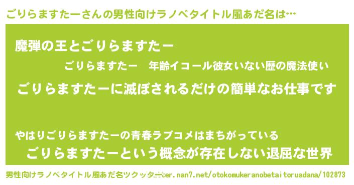 | 意味不明あだ名 | 『住所不定無職ごりらますたー(13歳)』 |