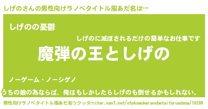 | 女子向けラノベタイトル風あだ名 | 『乙女ゲームの破滅フラグしかない悪役しげのに転生してしまった…』 |