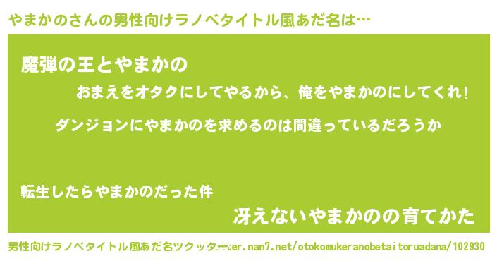 | 女子向けラノベタイトル風あだ名 | 『やまかのの卵を拾いまして』 |