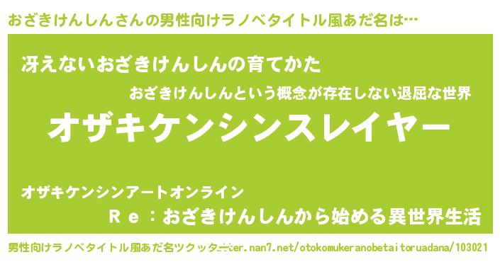 | 女子向けラノベタイトル風あだ名 | 『婚約破棄系悪役おざきけんしんに転生したので、保身に走りました。』 |