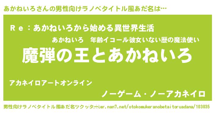 | 女子向けラノベタイトル風あだ名 | 『あかねいろが死なない童話 林檎のあかねいろの診療簿』 |