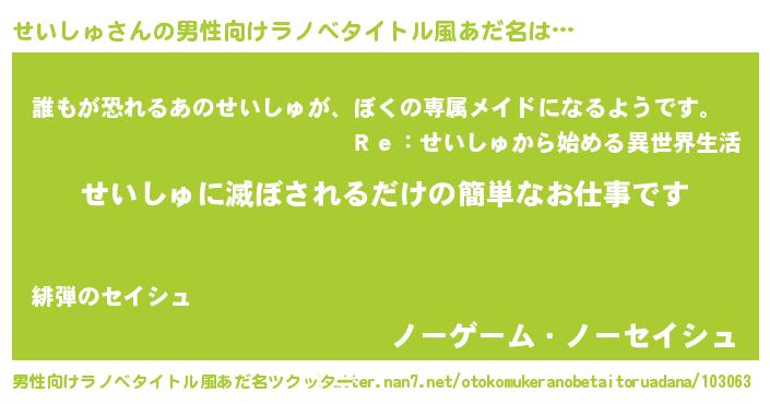 | ヘコむあだ名 | 『せいしゅ(笑)』『せいにゅー』 |