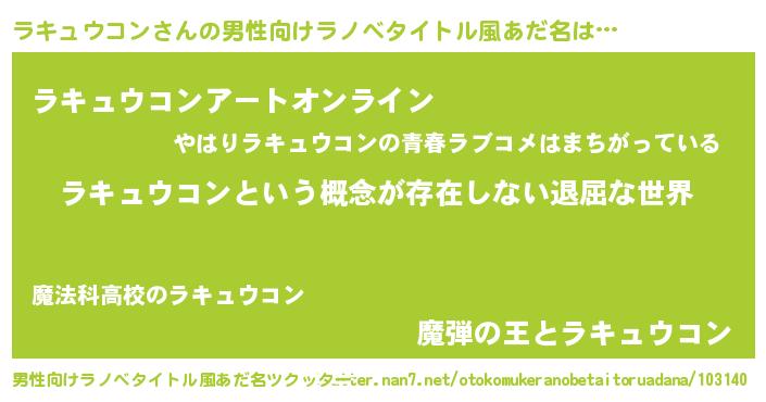 | 女子向けラノベタイトル風あだ名 | 『異世界で失敗しない100のラキュウコン』 |