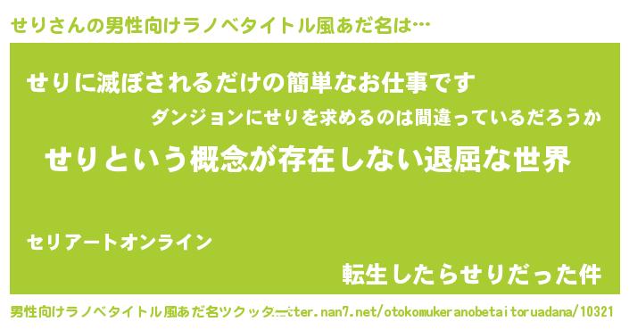 | 胡散臭い通販商品みたいなあだ名 | 『絶対に幸福をもたらす水素水…その名も「せり」』 |