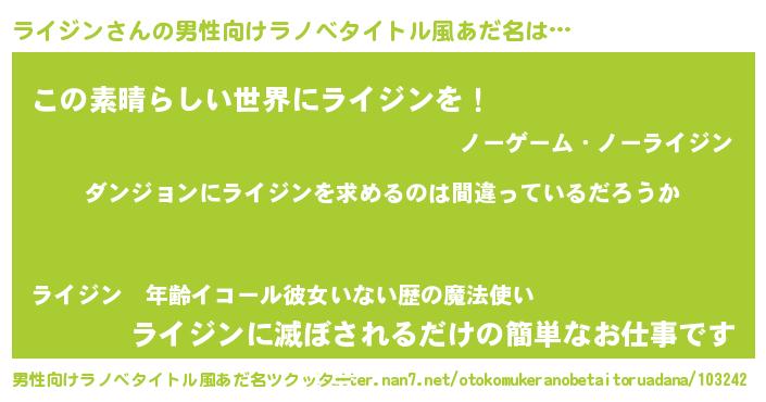 | 胡散臭い通販商品みたいなあだ名 | 『信頼と実績のサプリメント…その名も「ライジン」』 |
