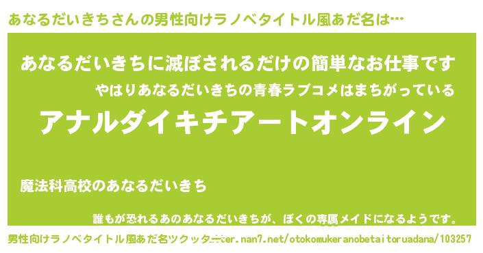 | 女子向けラノベタイトル風あだ名 | 『誰かこのあなるだいきちを説明してください! ~契約から始まるウェディング~』 |