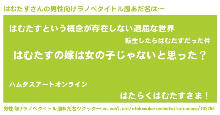| 胡散臭い通販商品みたいなあだ名 | 『全米が絶賛したサプリメント…その名も「はむたす」』 |