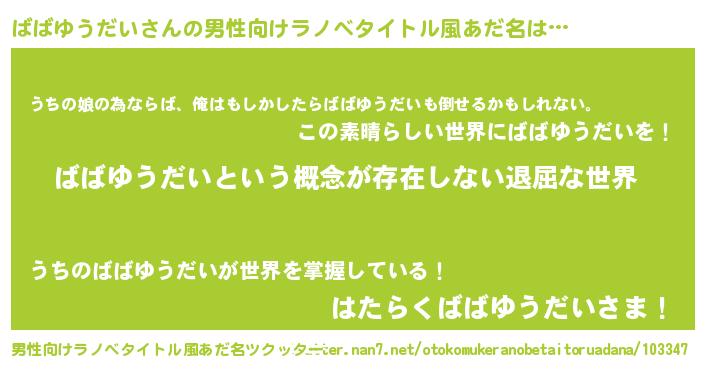 | 女子向けラノベタイトル風あだ名 | 『ばばゆうだいの契約王妃』 |