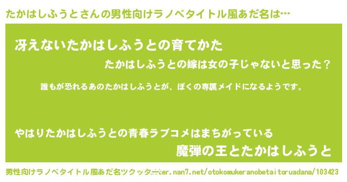 | 胡散臭い通販商品みたいなあだ名 | 『前代未聞の健康食品…その名も「たかはしふうと」』 |