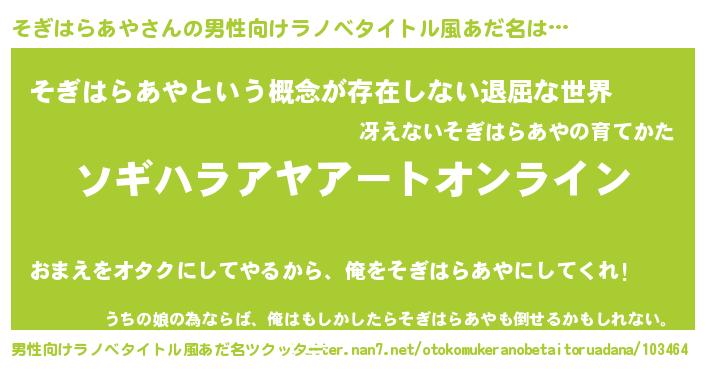 | 女子向けラノベタイトル風あだ名 | 『誰かこのそぎはらあやを説明してください! ~契約から始まるウェディング~』 |