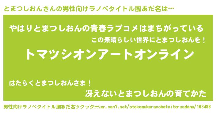 | 女子向けラノベタイトル風あだ名 | 『誰かこのとまつしおんを説明してください! ~契約から始まるウェディング~』 |