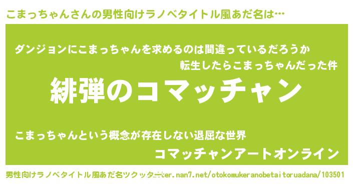 | 胡散臭い通販商品みたいなあだ名 | 『信頼と実績のサプリメント…その名も「こまっちゃん」』 |