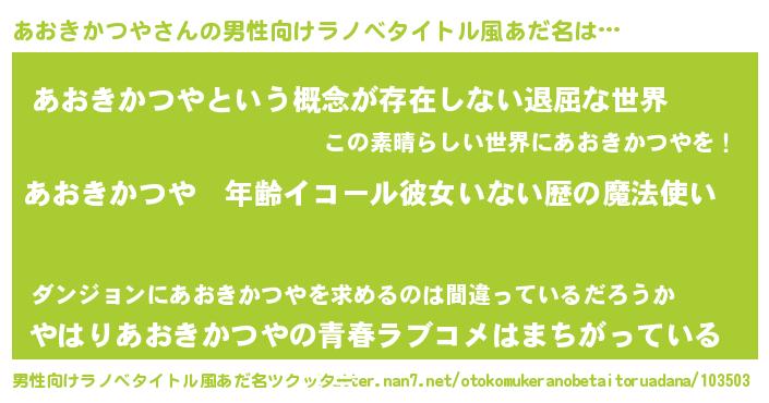 | 女子向けラノベタイトル風あだ名 | 『あおきかつやの玉の輿計画!』 |