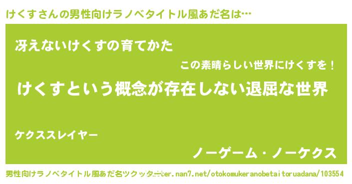 | 女子向けラノベタイトル風あだ名 | 『異世界で失敗しない100のけくす』 |