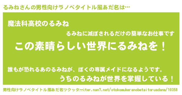 | 女子向けラノベタイトル風あだ名 | 『乙女ゲームの破滅フラグしかない悪役るみねに転生してしまった…』 |