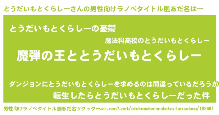| 意味不明あだ名 | 『住所不定無職とうだいもとくらしー(53歳)』 |