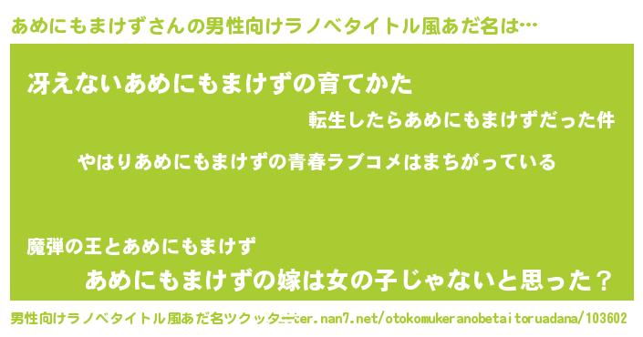 | 女子向けラノベタイトル風あだ名 | 『あめにもまけずの雑貨屋さん』 |