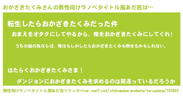 | 女子向けラノベタイトル風あだ名 | 『おかざきたくみの婚約者』 |
