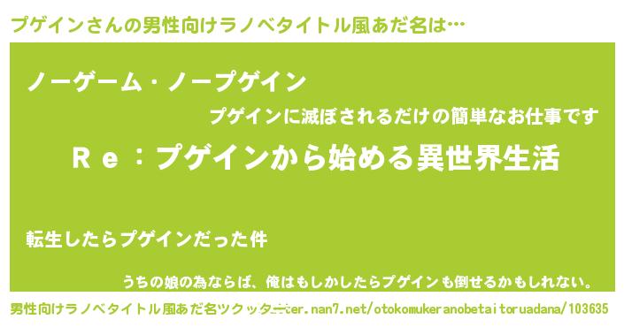 | 女子向けラノベタイトル風あだ名 | 『闇のプゲイン』『死神プゲインの再婚』 |