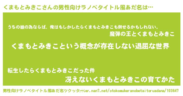 | 女子向けラノベタイトル風あだ名 | 『くまもとみきこの契約王妃』 |