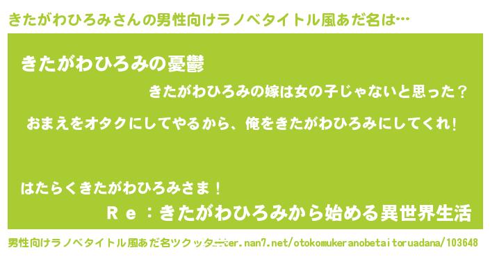 | 女子向けラノベタイトル風あだ名 | 『きたがわひろみ夫妻のなれそめ』 |