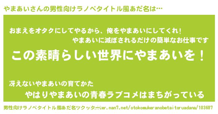 | 女子向けラノベタイトル風あだ名 | 『悪役やまあいに転生したようですが、知った事ではありません』 |