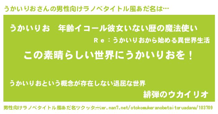 | 意味不明あだ名 | 『住所不定無職うかいりお(68歳)』 |