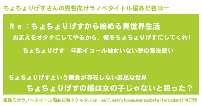 | 女子向けラノベタイトル風あだ名 | 『ちょちょりげすの玉の輿計画!』 |