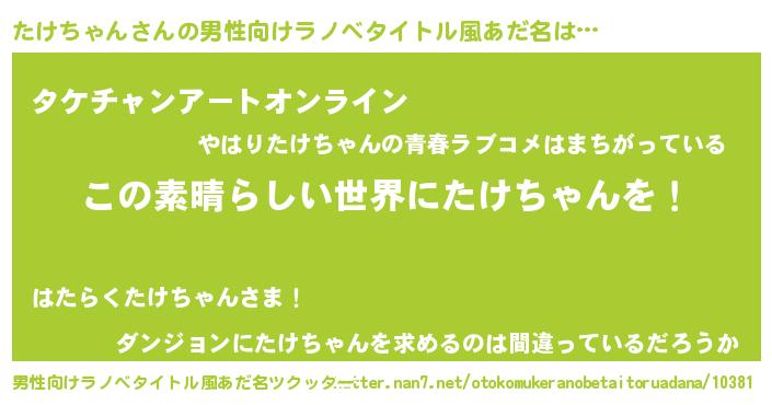| 女子向けラノベタイトル風あだ名 | 『悪役たけちゃんに転生したようですが、知った事ではありません』 |