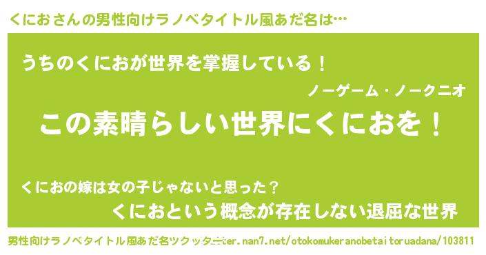 | 女子向けラノベタイトル風あだ名 | 『悪役くにおに転生したようですが、知った事ではありません』 |