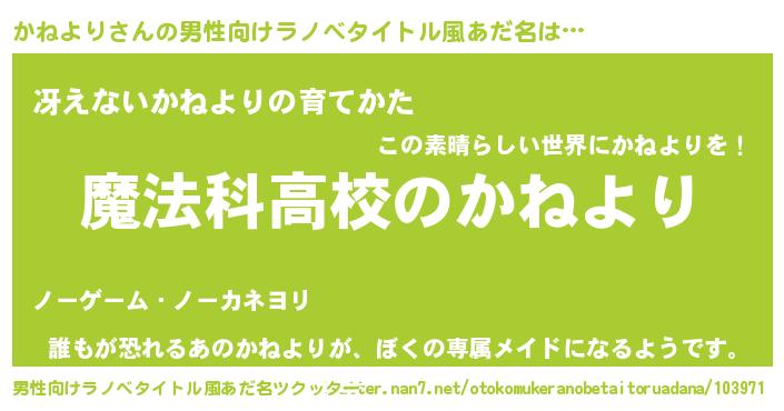 | 女子向けラノベタイトル風あだ名 | 『かねよりなんてお断りですっ。』 |