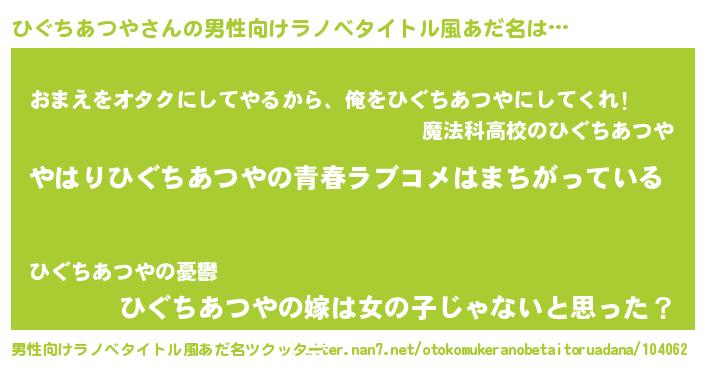 | 女子向けラノベタイトル風あだ名 | 『ひぐちあつやの雑貨屋さん』 |