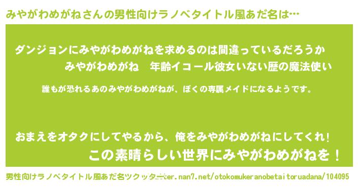 | 胡散臭い通販商品みたいなあだ名 | 『来世でも幸せになれる健康食品…その名も「みやがわめがね」』 |