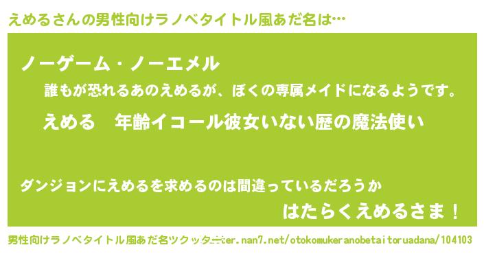 | 女子向けラノベタイトル風あだ名 | 『えめるの玉の輿計画!』 |