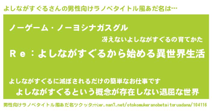 | ヘコむあだ名 | 『よしながすぐる(震え声)』『よしっふぃ~』 |