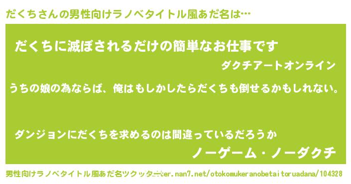 | 女子向けラノベタイトル風あだ名 | 『だくち伯爵の花嫁』『だくち恋絵巻』 |