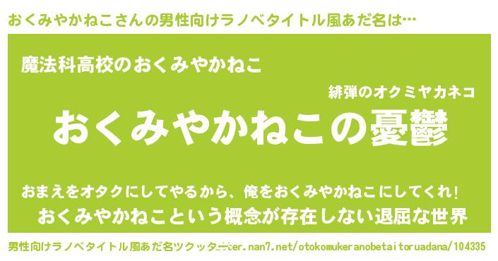 | 女子向けラノベタイトル風あだ名 | 『(仮)おくみやかねこのやんごとなき事情』 |