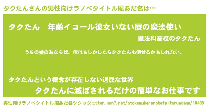 | 女子向けラノベタイトル風あだ名 | 『タクたん伯爵の花嫁』 |