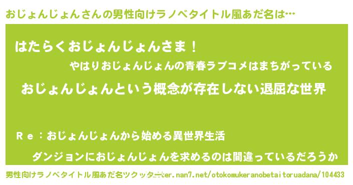 | 女子向けラノベタイトル風あだ名 | 『異世界で失敗しない100のおじょんじょん』 |
