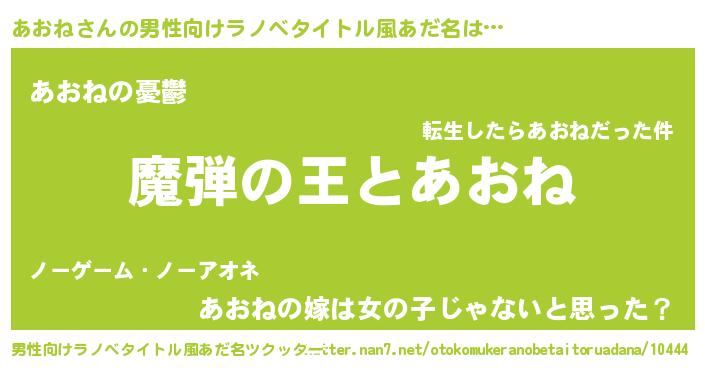 | 女子向けラノベタイトル風あだ名 | 『乙女ゲームの破滅フラグしかない悪役あおねに転生してしまった…』 |