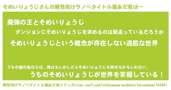 | 女子向けラノベタイトル風あだ名 | 『異世界で失敗しない100のそめいりょうじ』 |