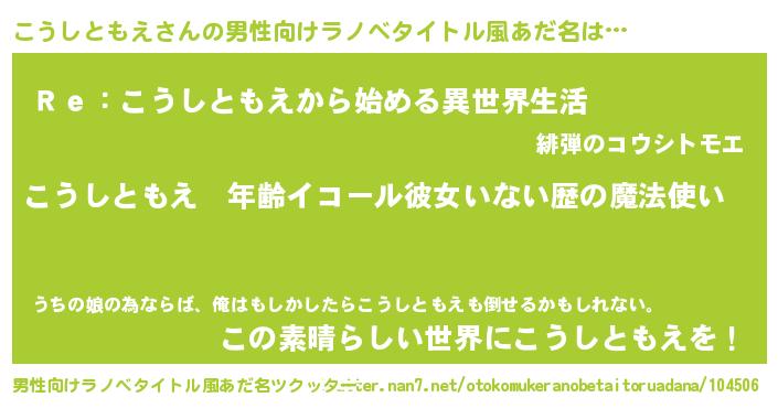 | 女子向けラノベタイトル風あだ名 | 『こうしともえの玉の輿計画!』 |