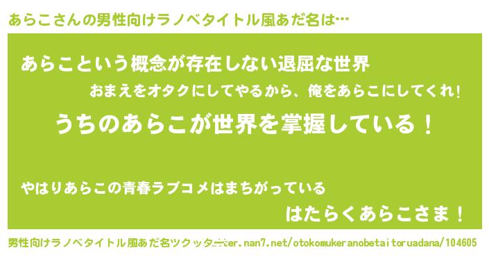 | 胡散臭い通販商品みたいなあだ名 | 『前代未聞の水素水…その名も「あらこ」』 |