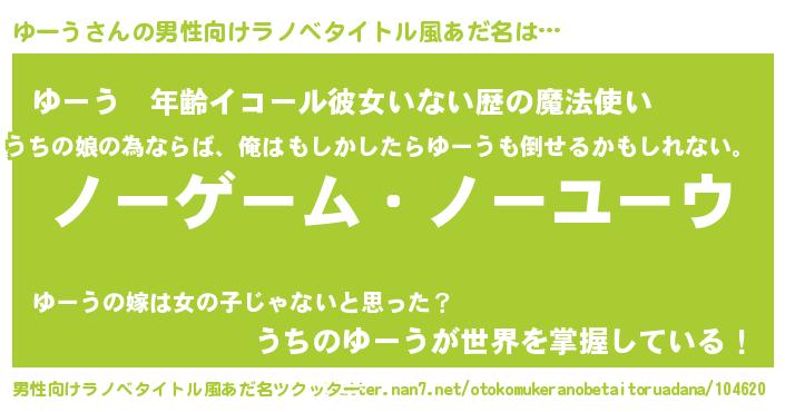 | 女子向けラノベタイトル風あだ名 | 『ゆーう恋絵巻』『ゆーうの玉の輿計画!』 |