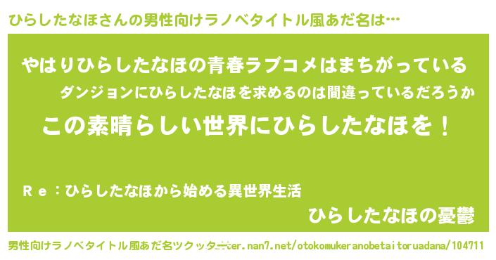 | 胡散臭い通販商品みたいなあだ名 | 『あなたにだけ特別に提供する限定10本のレアな日本酒…その名も「ひらしたなほ」』 |