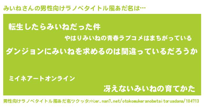 | 女子向けラノベタイトル風あだ名 | 『みいねの卵を拾いまして』 |
