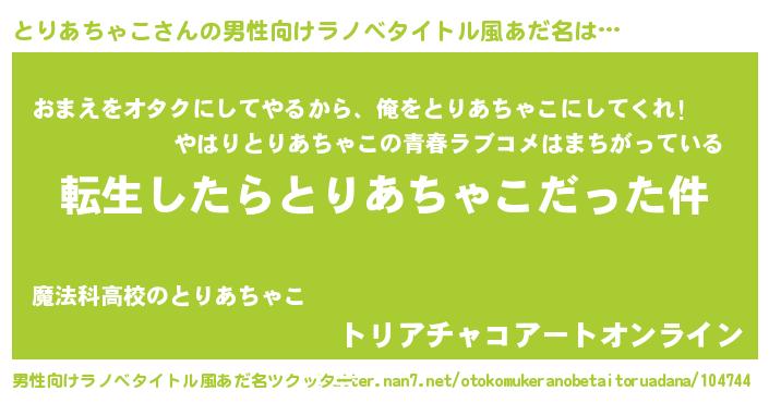 | 女子向けラノベタイトル風あだ名 | 『とりあちゃこの玉の輿計画!』 |