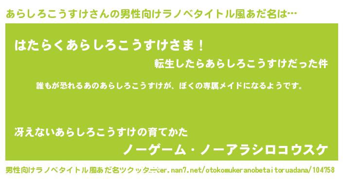 | 女子向けラノベタイトル風あだ名 | 『あらしろこうすけの契約王妃』 |