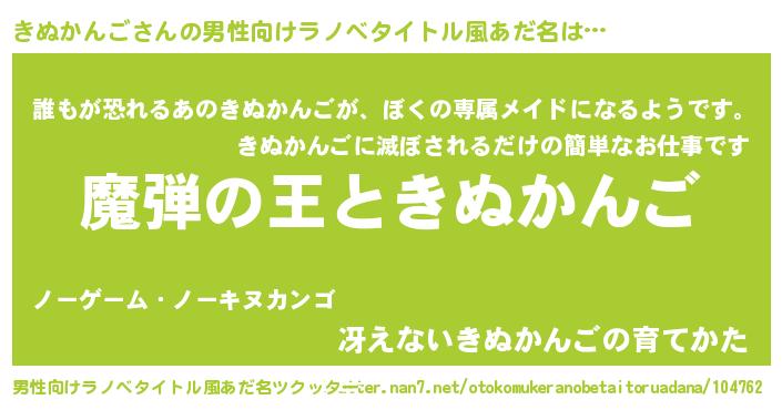 | 女子向けラノベタイトル風あだ名 | 『きぬかんごが死なない童話 林檎のきぬかんごの診療簿』 |