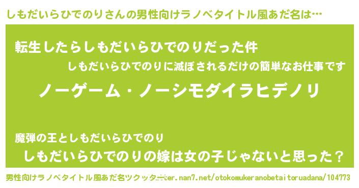 | 女子向けラノベタイトル風あだ名 | 『死神しもだいらひでのりの再婚』 |